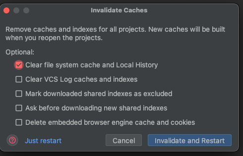 Clear file system cache and Local History 체크 후 invalidate and restart