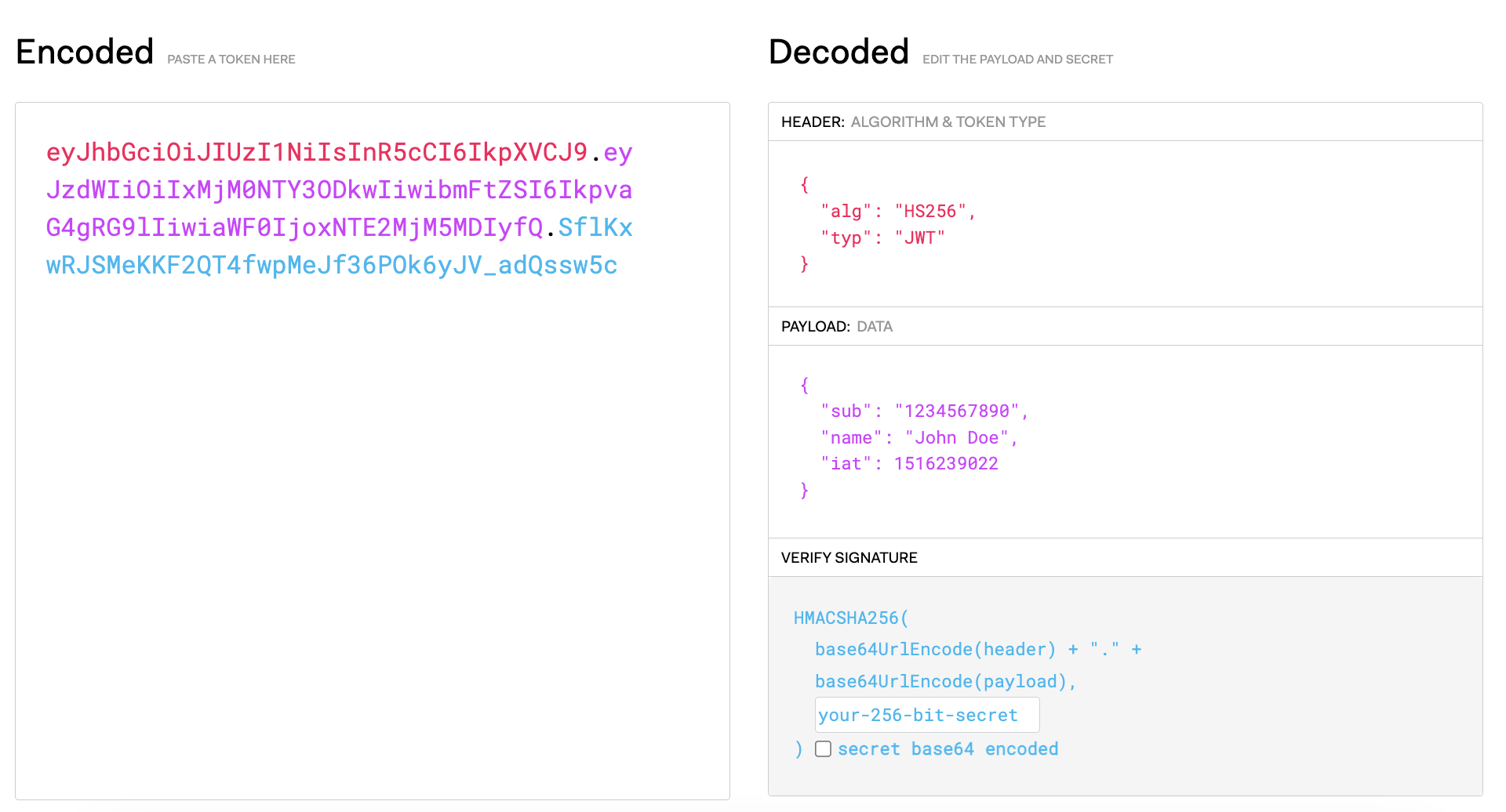 Header와 Payload는 base64로 인코딩 되어있고, signature는 Header, Payload, Secret key를 HS256 방식으로 암호화한 다음 base64로 인코딩 되어있다.